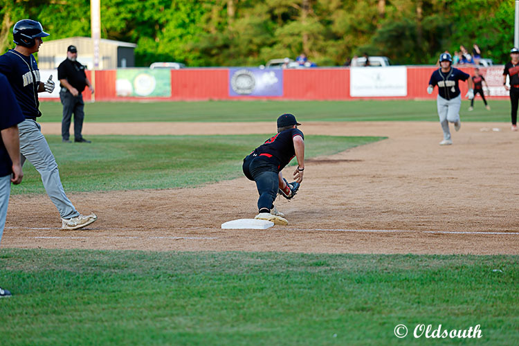 Sophomore Bridger McCann gets the double play for Caldwell at first in bi-district action with #24 Avoyelles